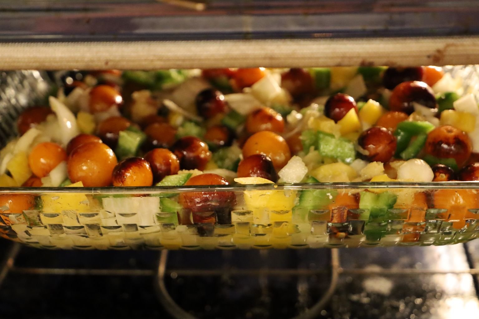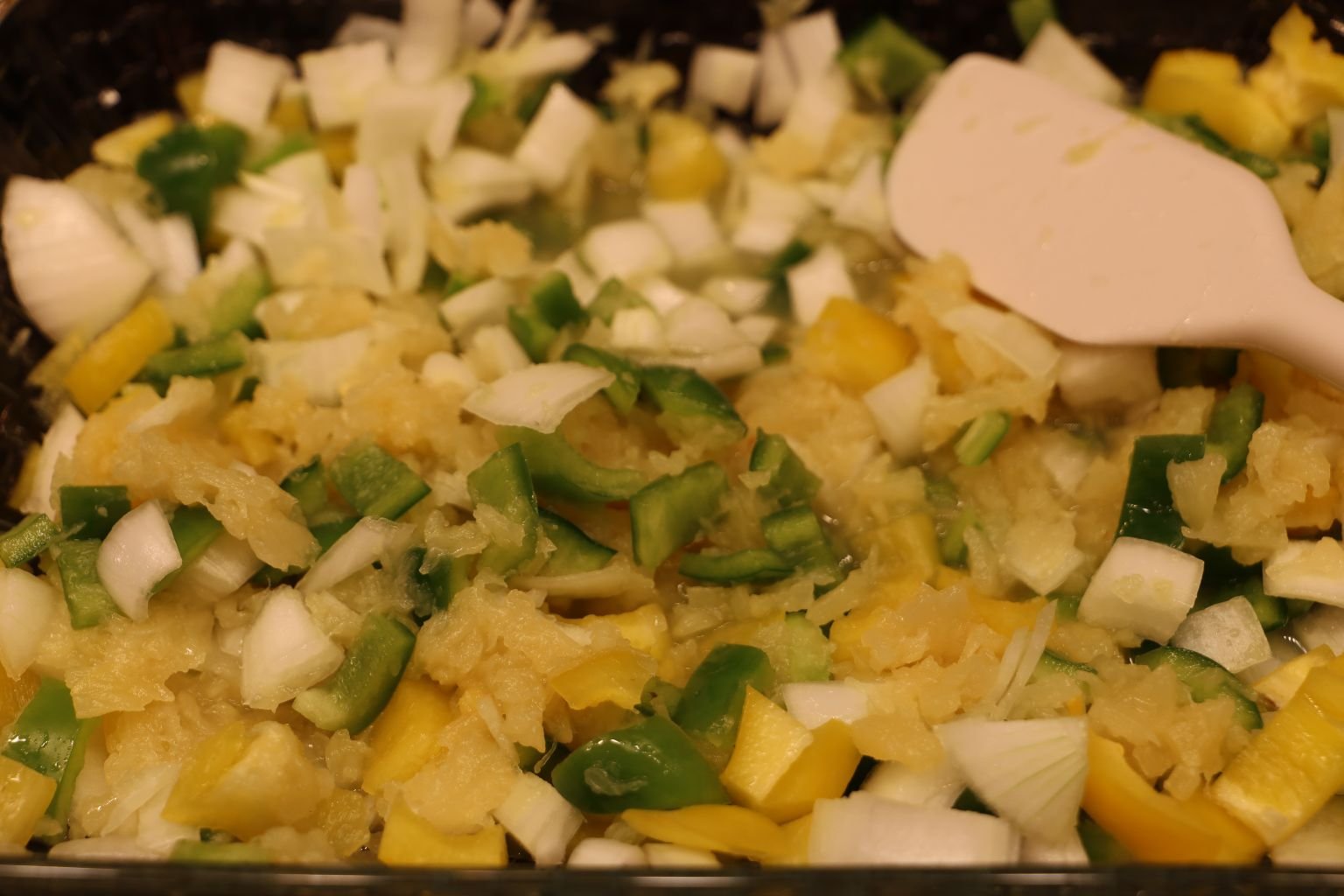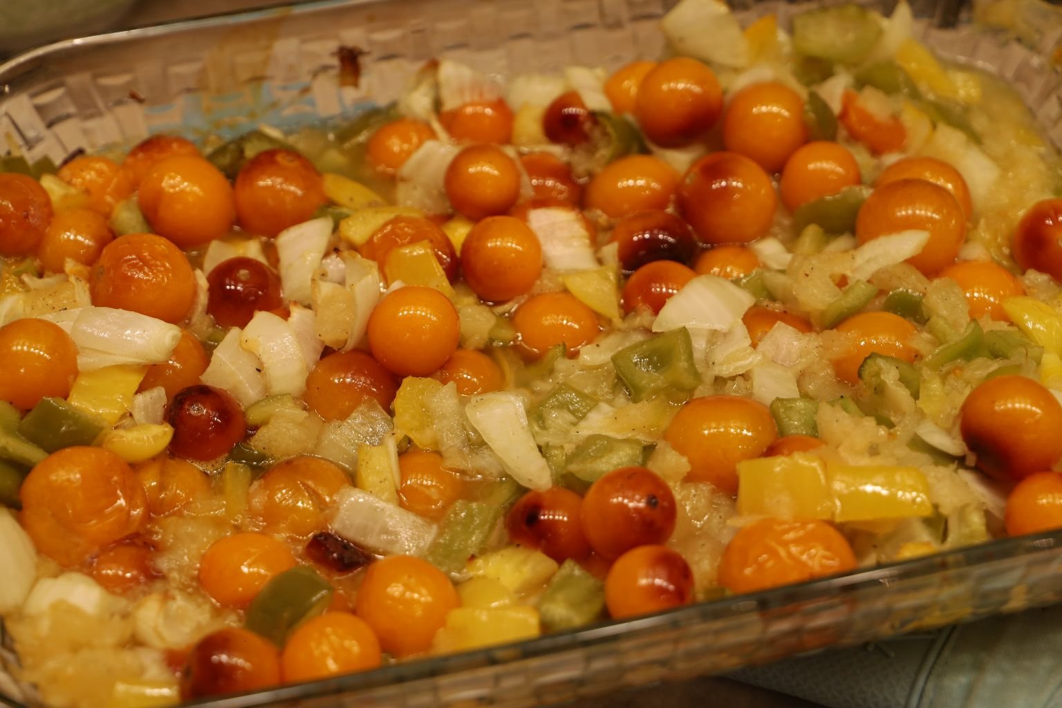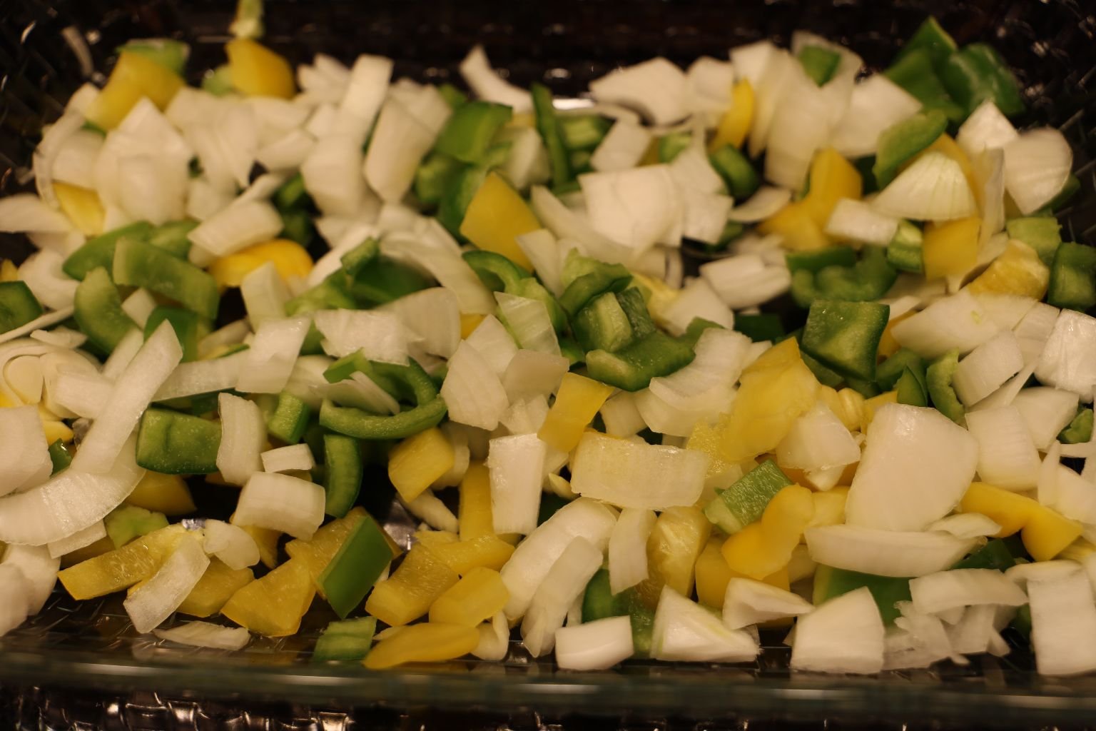 In a Casserole Dish I placed my chopped Green and Yellow Bell Peppers, as much as I liked.