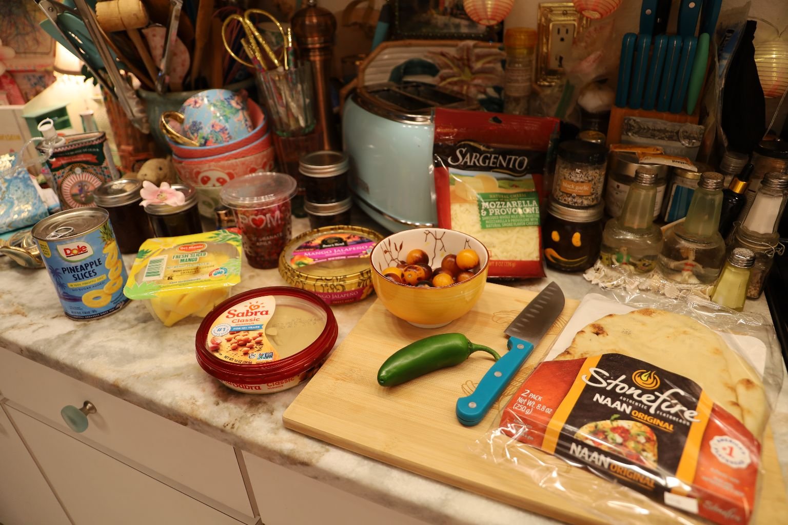 I already had the Naan, the Tomatoes, Pomegranate Seeds, and some canned Dole Pineapple Rings.
